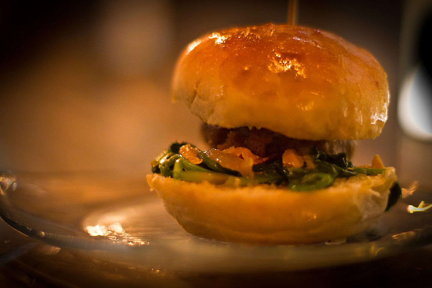 Abbiamo iniziato con un panino, in tipico stile Open. Polpetta di montone, spinaci al vapore, guanciale di Cori cotto nella Duchessa e pecorino. Il pane: farro, lievito naturale e miele. Abbinato all’Enkir. Decisamente convincente.