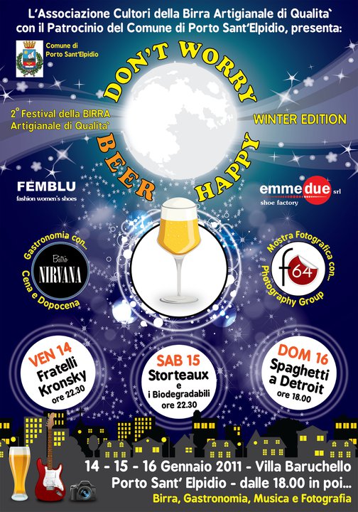 Da venerdì 14 a domenica 16 gennaio troverete le produzioni della Birra del Borgo tra le spine della manifestazione Don’t worry, beer happy – winter edition, ospitata dalla Villa Baruchello di Porto Sant’Elpidio (FM). Saranno presenti 13 birre alla spina e 2 a pompa, provenienti dai più famosi birrifici italiani, oltre al “padrone di casa”, il neonato Mukkeller. Inoltre ci sarà un angolo “bottiglie trappiste”, con le tipiche birre belghe dei frati cistercensi.